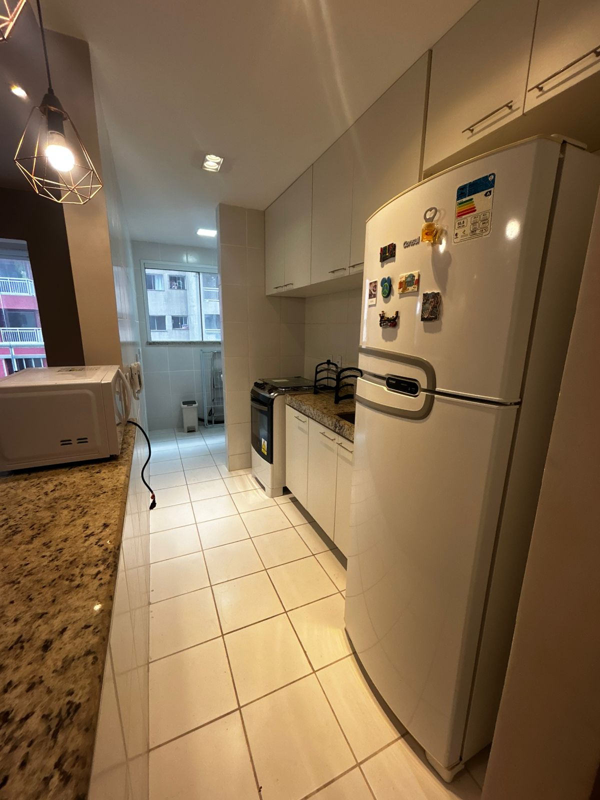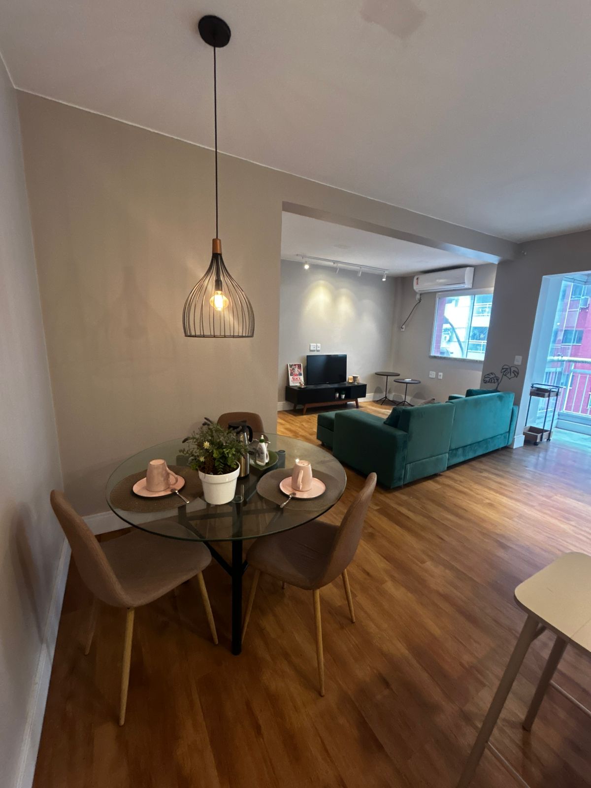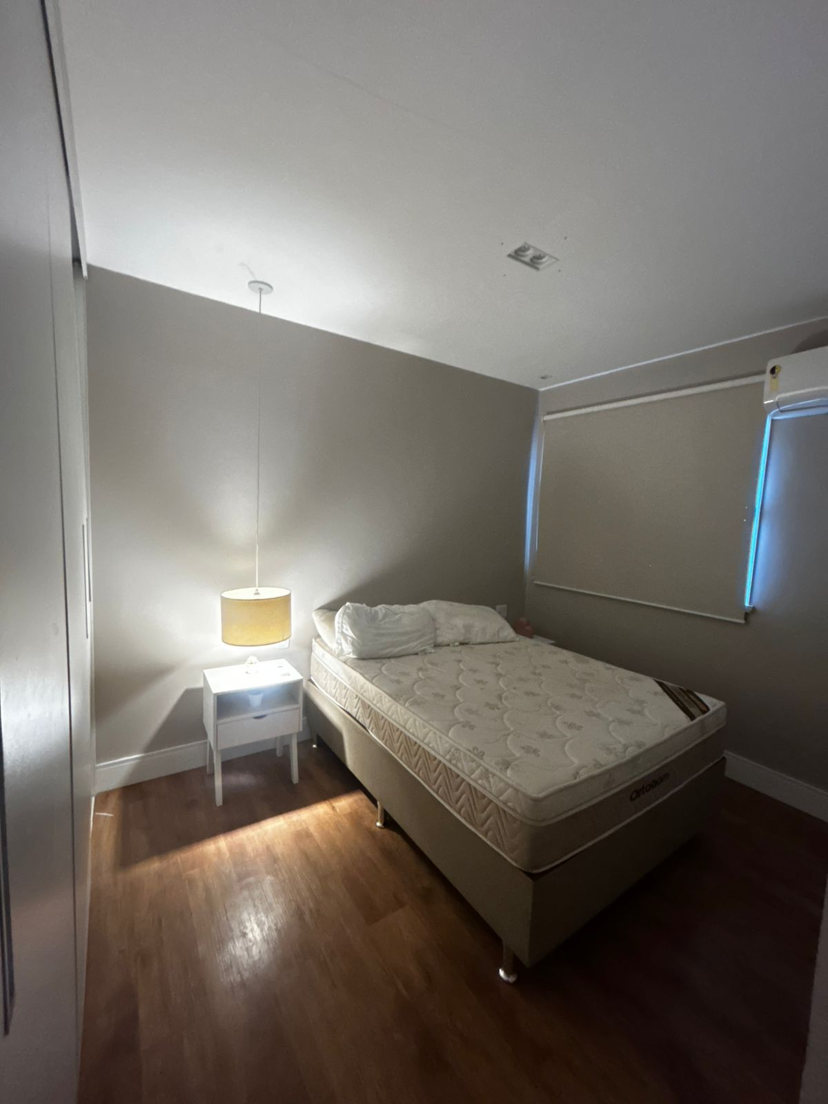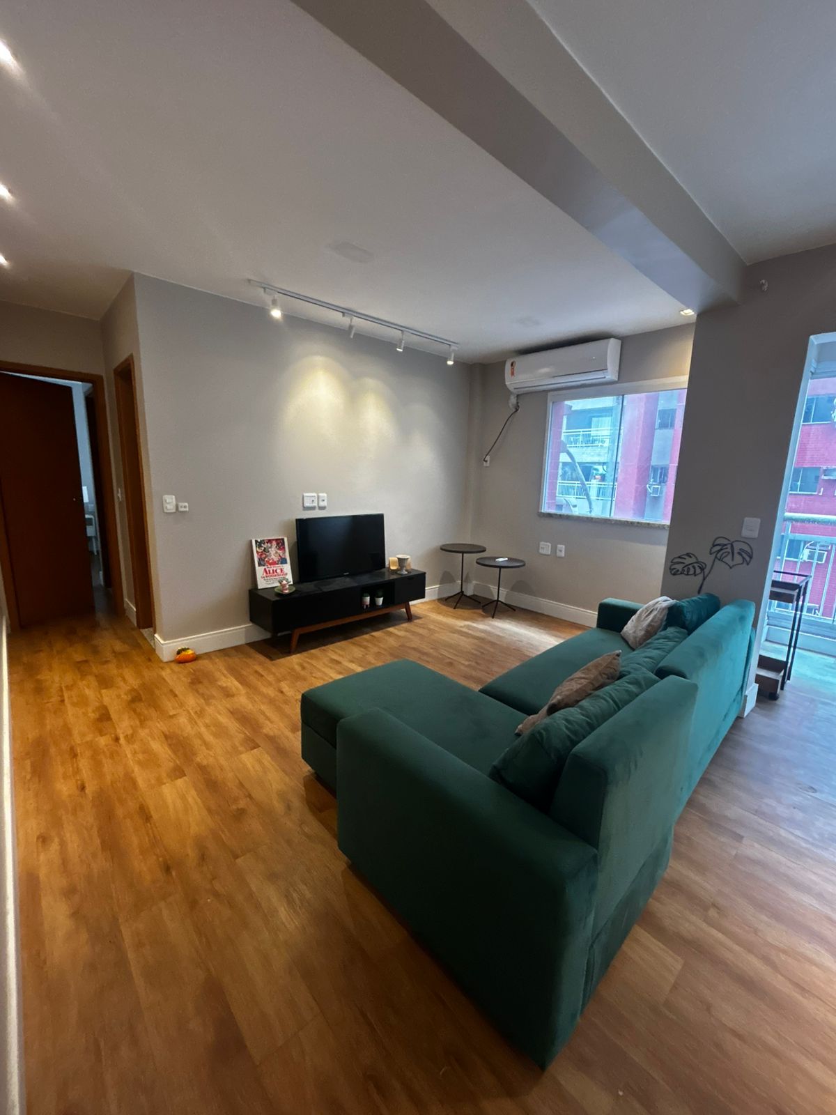 Sala de estar ampla e sala de jantar, com sofá, mesa com 3 cadeiras e TV. Sacada com proteção. 1 suíte com uma cama de casal, guarda roupa e ar-condicionado. 2 Banheiros. Cozinha com todos eletrodomésticos e armários. Área de serviço. 1 vaga de garagem coberta.