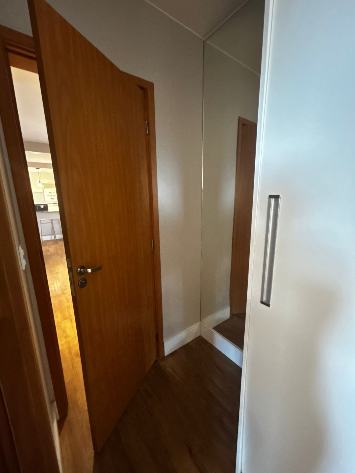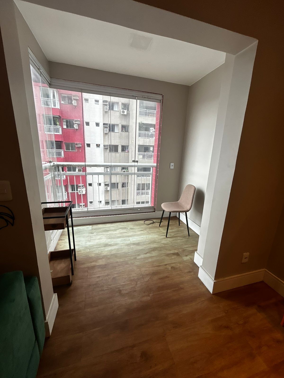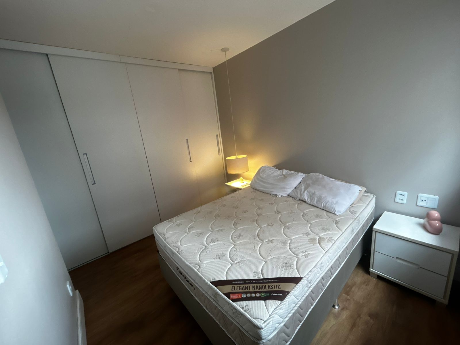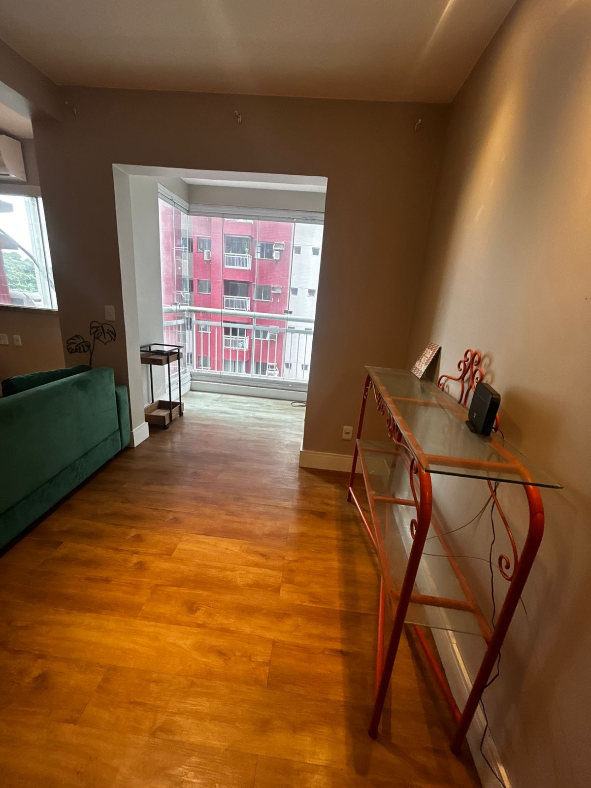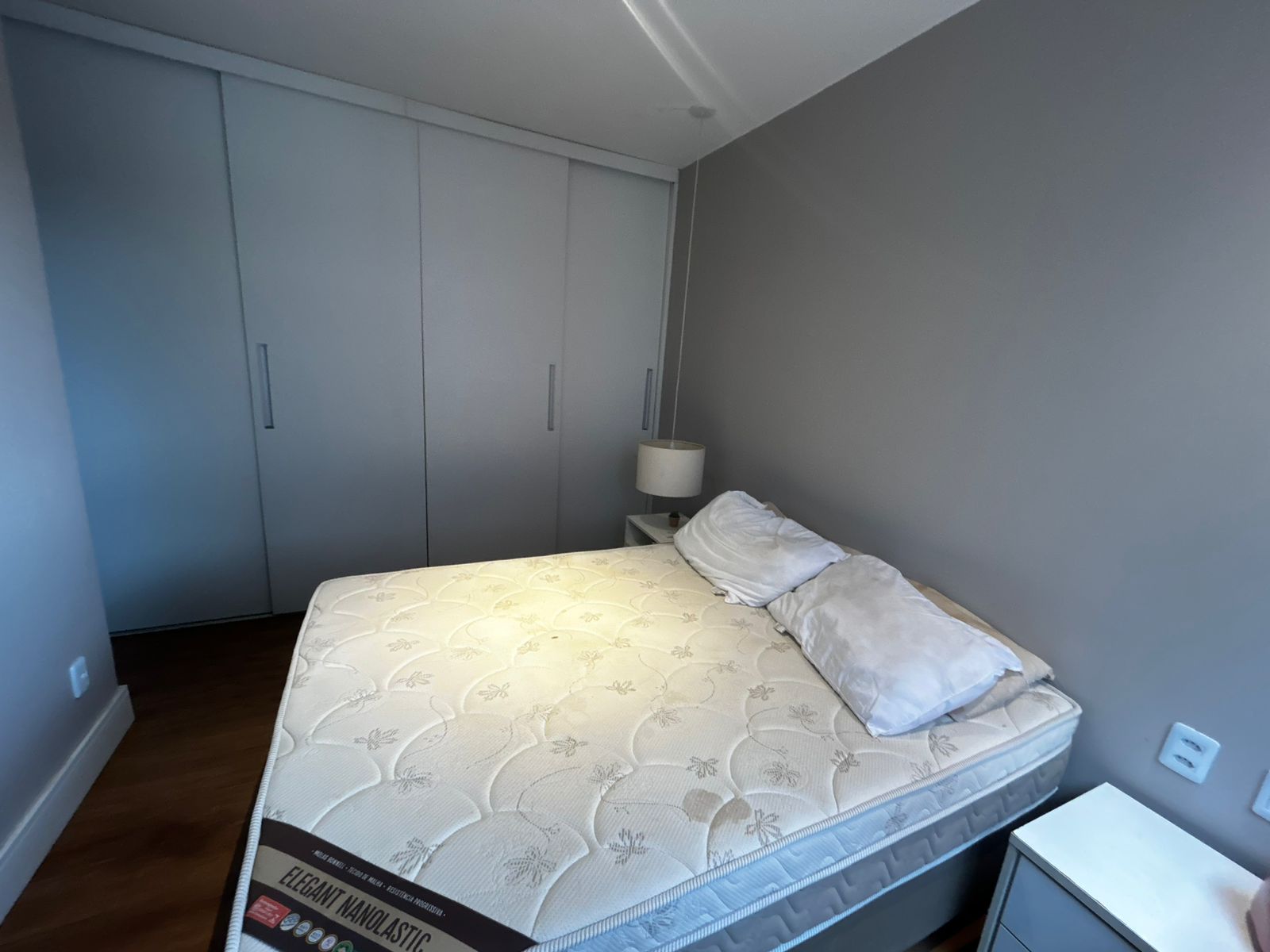 Sala de estar ampla e sala de jantar, com sofá, mesa com 3 cadeiras e TV. Sacada com proteção. 1 suíte com uma cama de casal, guarda roupa e ar-condicionado. 2 Banheiros. Cozinha com todos eletrodomésticos e armários. Área de serviço. 1 vaga de garagem coberta.
